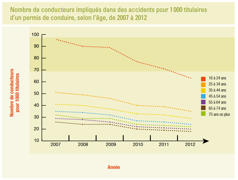 De fait, être un conducteur débutant est souvent synonyme de conducteur à risque. Le graphique ci-dessous montre bien l’écart entre l’implication des jeunes de 16 à 24 ans dans les accidents de la route et celle des autres groupes d’âge. Il est reconnu que les jeunes ont tendance, plus que leurs aînés, à adopter des comportements dangereux au volant, dont la vitesse excessive. En outre, pour un même taux d’alcoolémie, le risque d’accident mortel est plus élevé chez cette catégorie d’âge que chez les conducteurs plus âgés en raison de l’inexpérience à la fois en matière de conduite et de consommation d’alcool..
