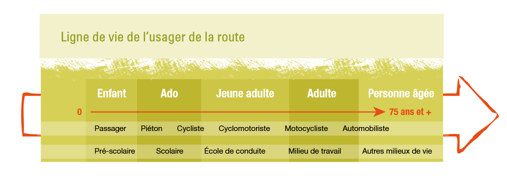 La ligne de vie ci-dessous présente le parcours qu’effectue l’usager de la route à partir du moment où il est un jeune passager dans son siège d’auto jusqu’à celui où il est appelé à renoncer progressivement à son permis de conduire. Entre ces deux moments, la personne fera divers usages du réseau routier (comme piéton, cycliste, cyclomotoriste, motocycliste, automobiliste, etc.) dont chacun comporte ses exigences et ses règles